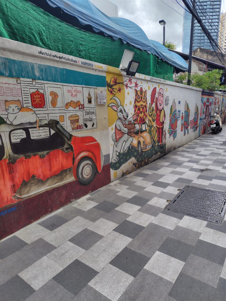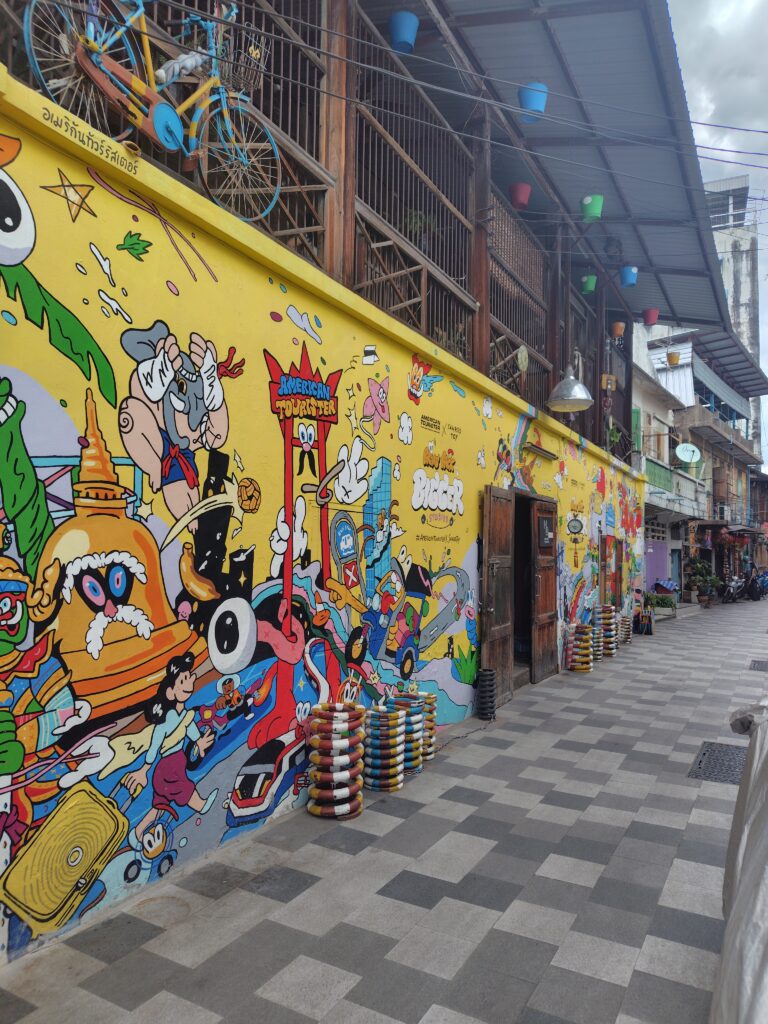 ここはバンコクの下町とアートが融合した人気スポットで、壁に描かれたアートやおしゃれなカフェが並んでいます☕️🎨