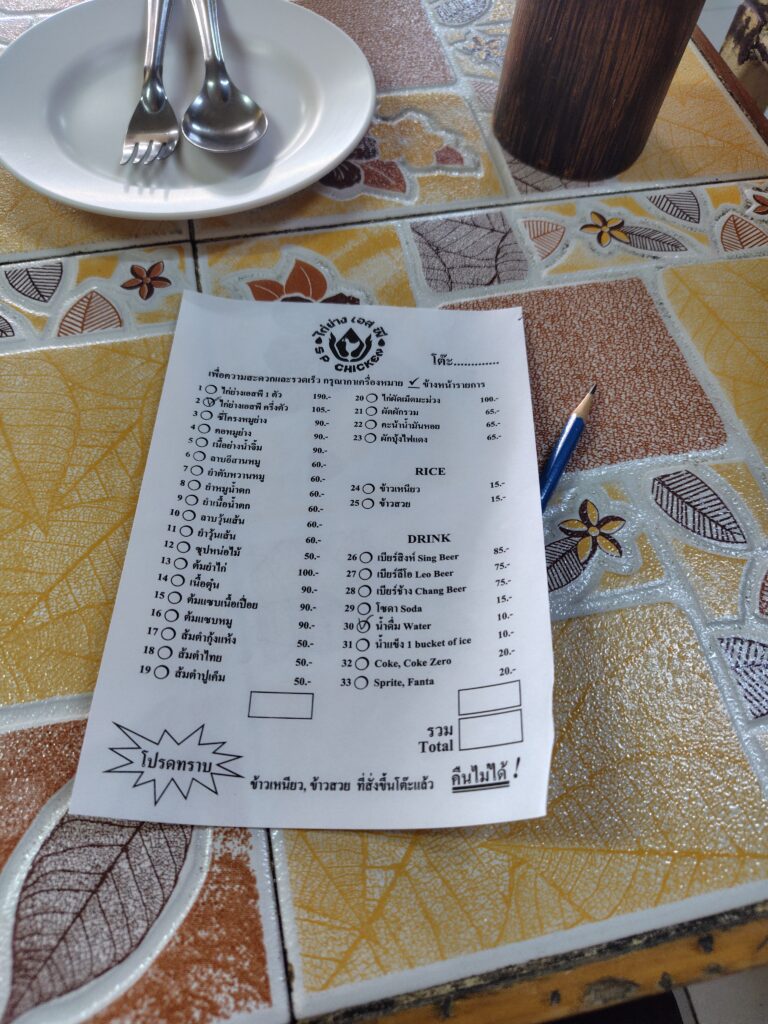 メニューには番号と英語が書いてあるのでタイ語が読めなくても大丈夫です