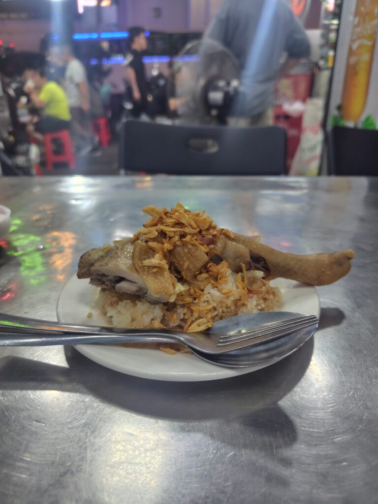 もち米の上に、揚げたチキン・ガーリック・揚げオニオンが乗ったご飯です。