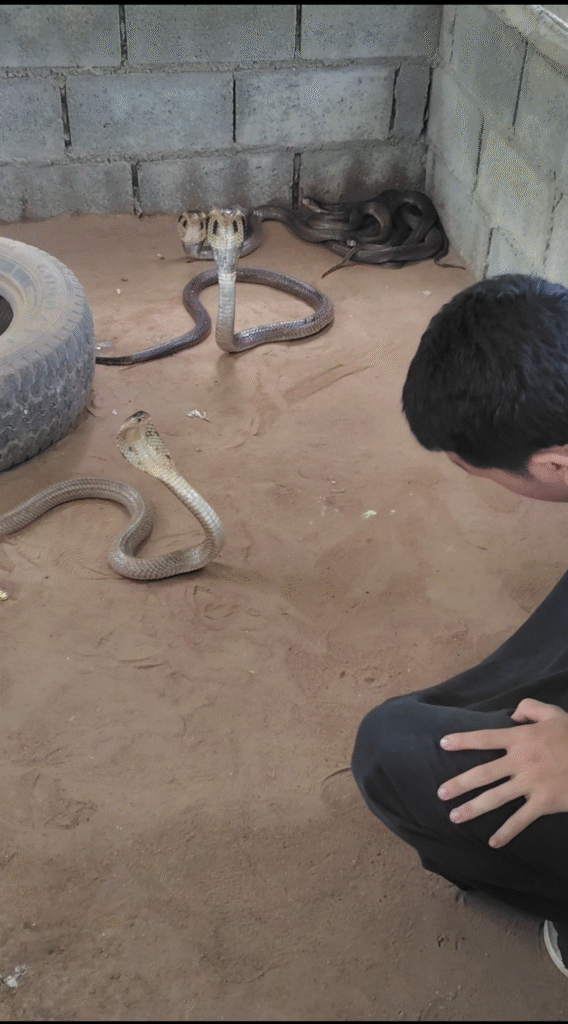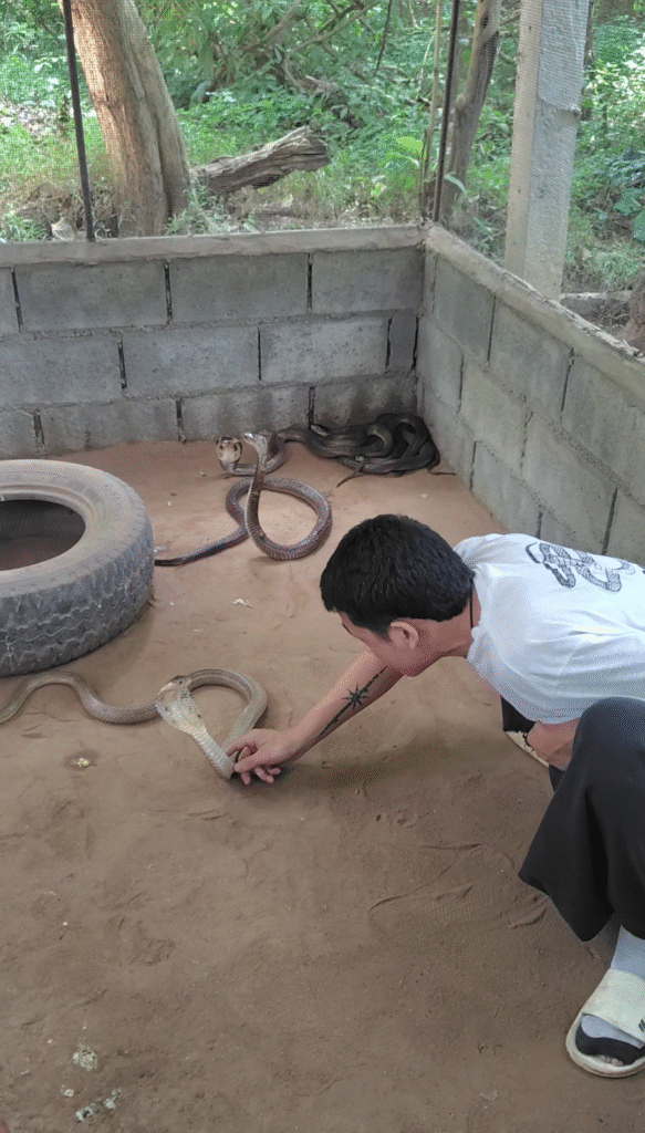 キングコブラとは別種で、コブラ界隈は仲が良く同室で暮らしてました(笑)スタッフさんが中に入って「コブラ芸」を見せてくれるんですが、