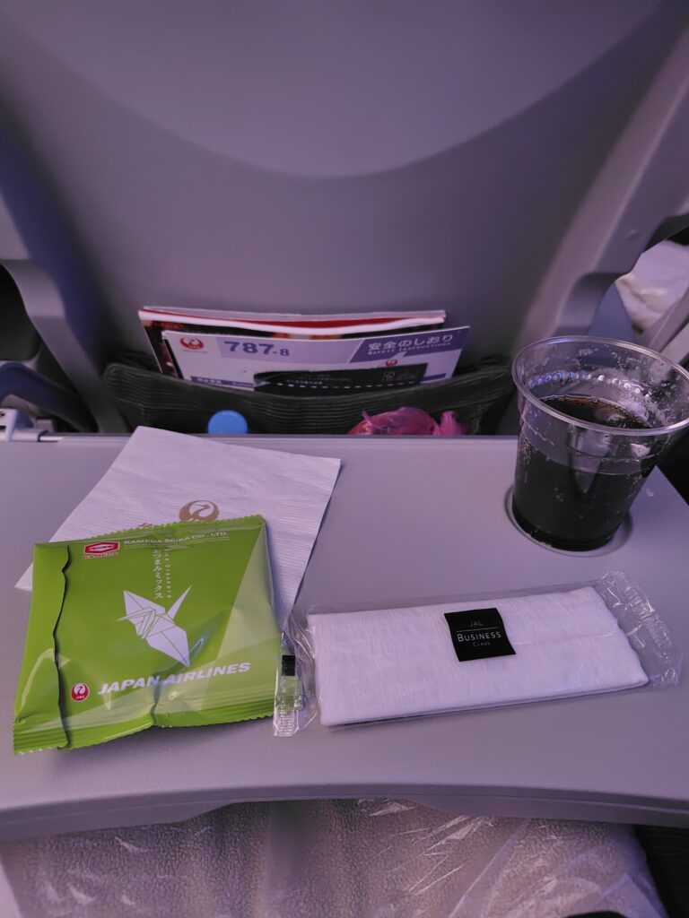 飛行機は深夜便だけど、おつまみと飲み物が出てうれしいサプライズ✨